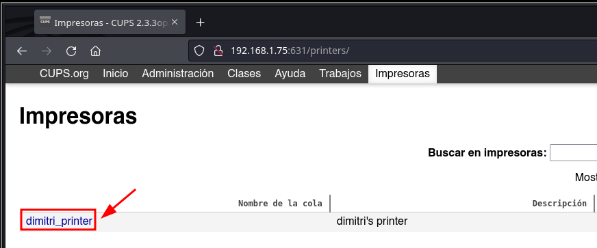 Identifico un CUPS y en Impresoras enumero al usuario dimitri