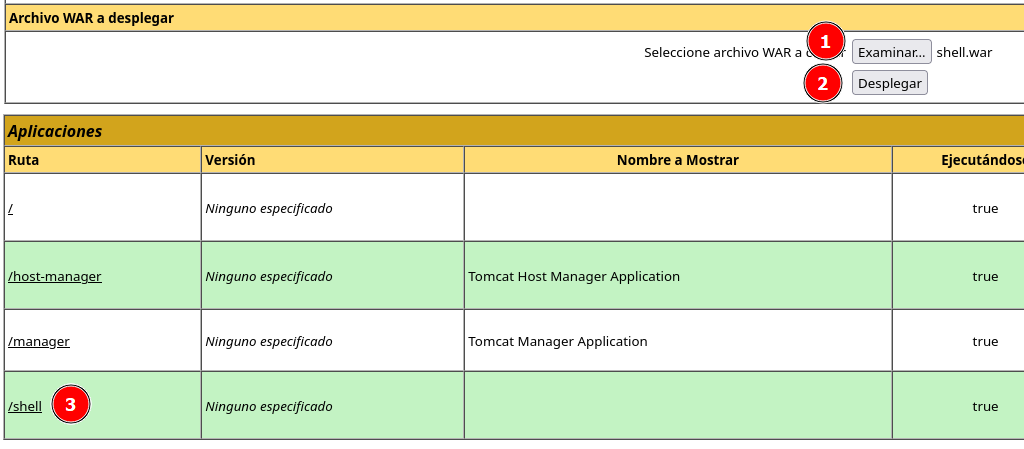 Ahora subo el archivo .war y al desplegar obtengo una shell como usuario tomcat