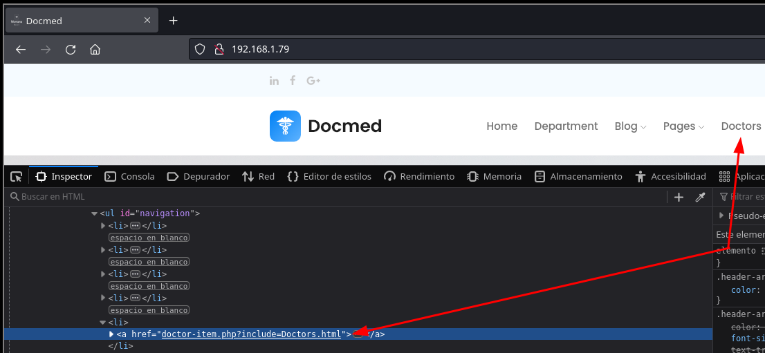En la sección Doctors de la navbar, se puede observar que mediante doctor-item.php incluye la página Doctors.html