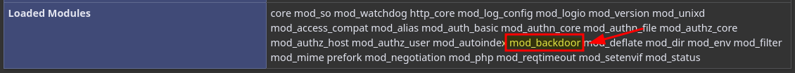 El archivo info.php es un phpinfo y revisando módulos cargados encuentro mod_backdoor