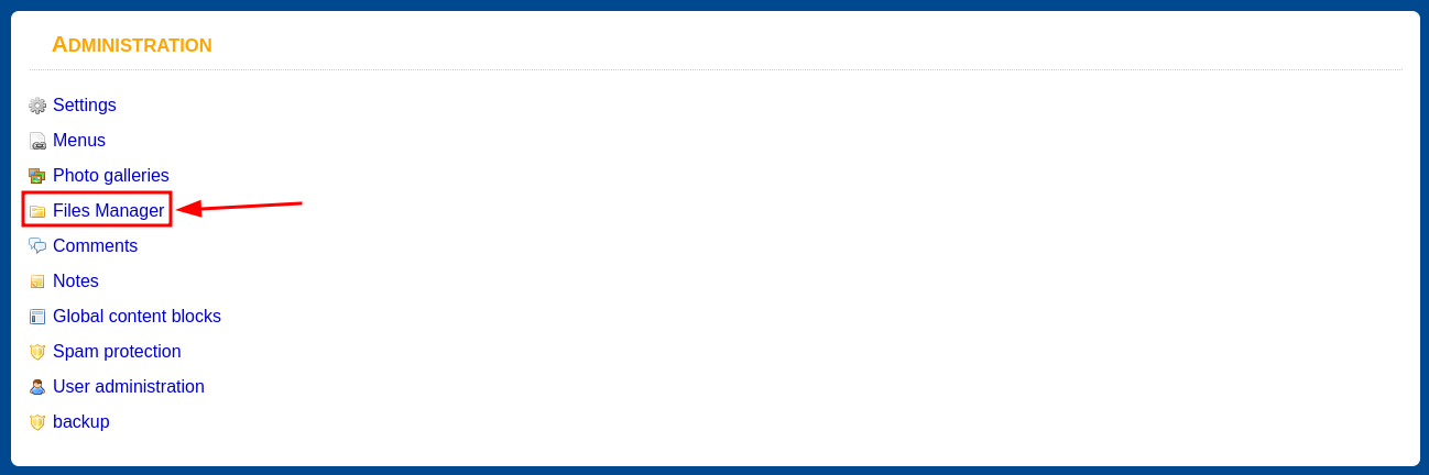 Hago click en Admin en la parte inferior y luego en la nueva página en Files Manager