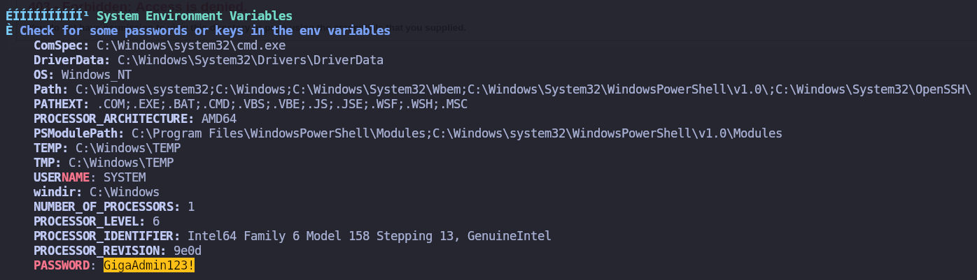 Enumero el sistema con winPEAS y obtengo un password en env variables