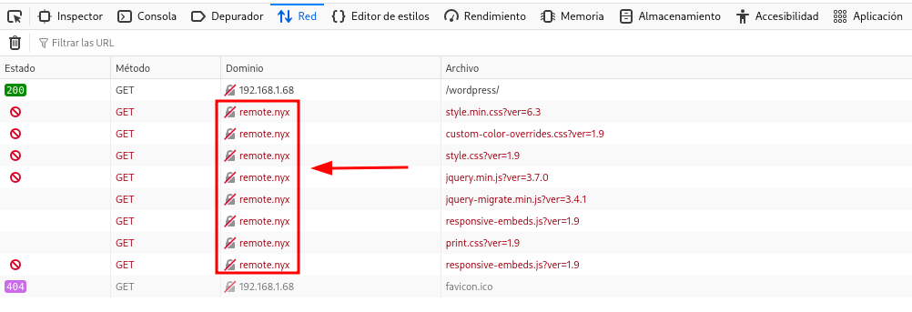 La página no se visualiza correctamente ya que intenta cargar las hojas de estilo del dominio remote.nyx