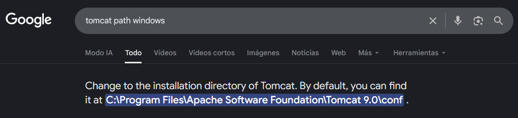Busco en internet la ruta por default de Tomcat en Windows