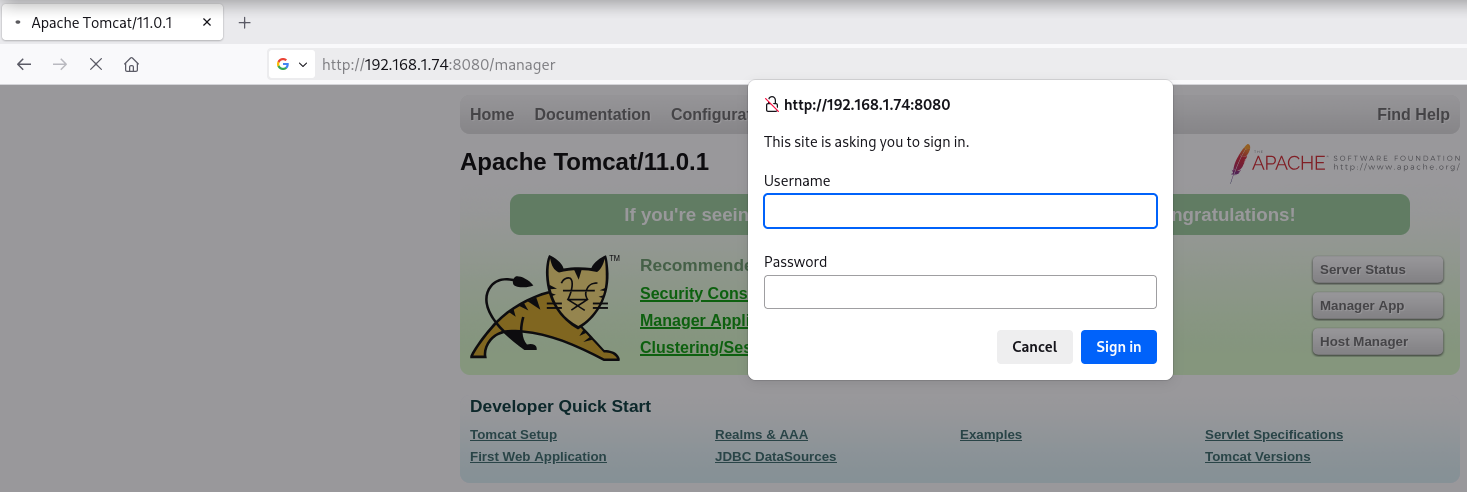 Me dirijo a la ruta típica /manager (Manager App) y solicita credenciales