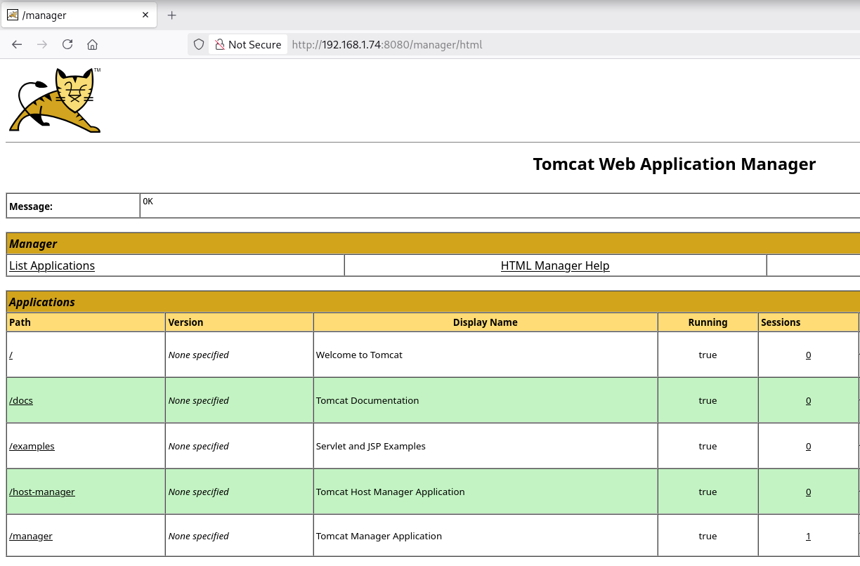 Accedo a Tomcat utilizando las credenciales obtenidas con éxito
