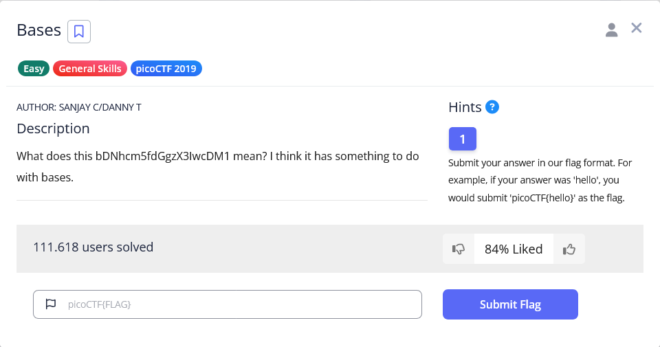 Bases es un challenge de dificultad fácil dentro de la categoría General Skills de la plataforma picoCTF y fue creado por el usuario SANJAY C/DANNY T.
